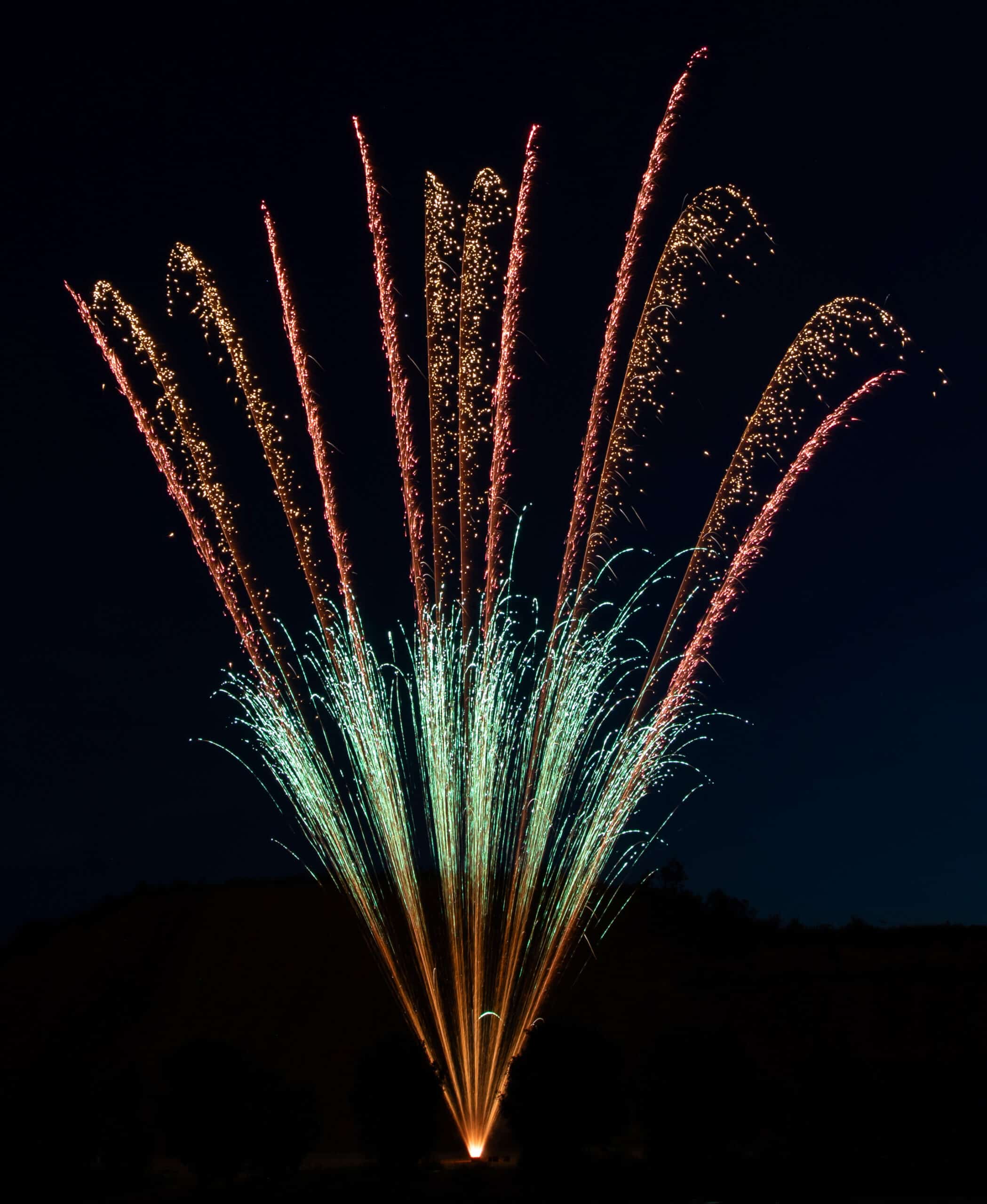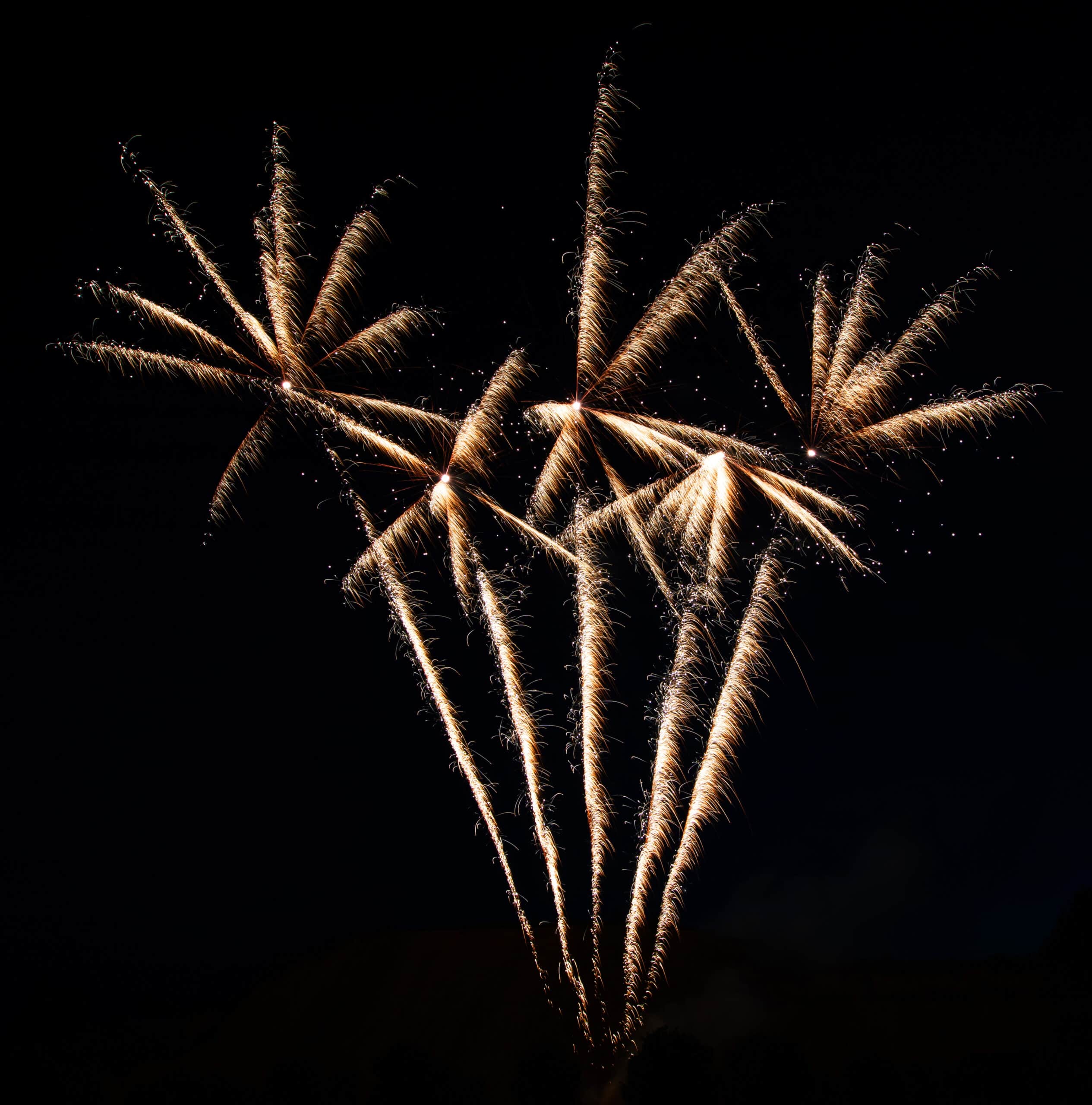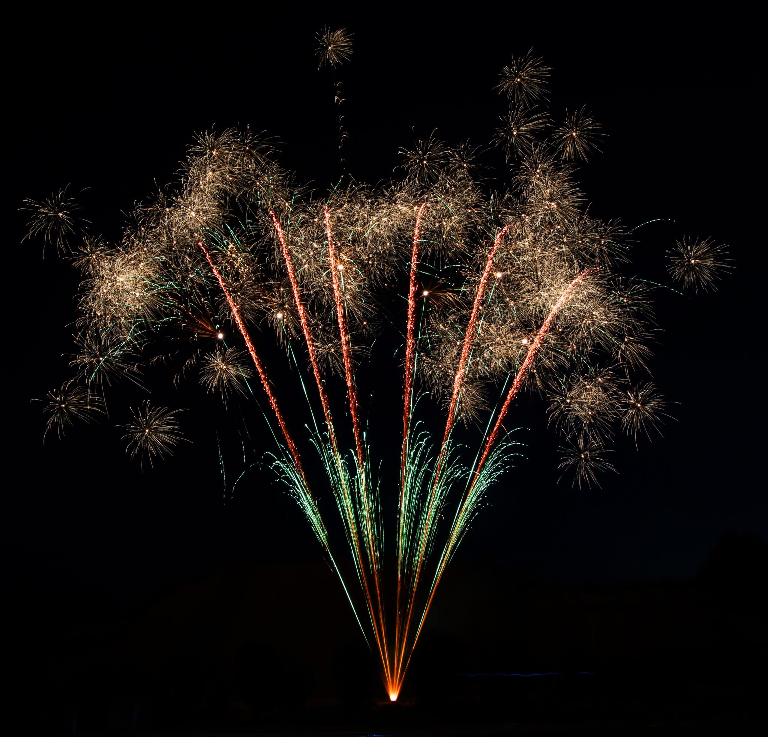 Variantenreiches Verbundfeuerwerk mit 4 Batterien und 124 Schuss; Phase 1: Grün glitzernde Feuertöpfe mit goldenen oder roten Blinkkometen, gefolgt von knisternden Chrysanthemen- Salven; Phase 2: Crackling-Aufstieg goldener Palmen mit Silberspitzen, gefolgt von Dragon- Egg-Effekten mit grün oder rot fallenden „Leaves-Effekten“ und anschließenden, gegabelten Feuertöpfen mit Popping-Chrysanthemen; Phase 3: Grün oder rot aufsteigende Leuchtsterne mit anschließender Verwandlung zu Silberchrysanthemen mit lang ziehenden Kometen, gefolgt von mächtigen Crackling-Fächern; Phase 4: Rasanter Abschluss aus 24 „Chaos-Kometen“, endend in 2 Salven mit lang ziehenden Knattersternen mit roten Blinkern.