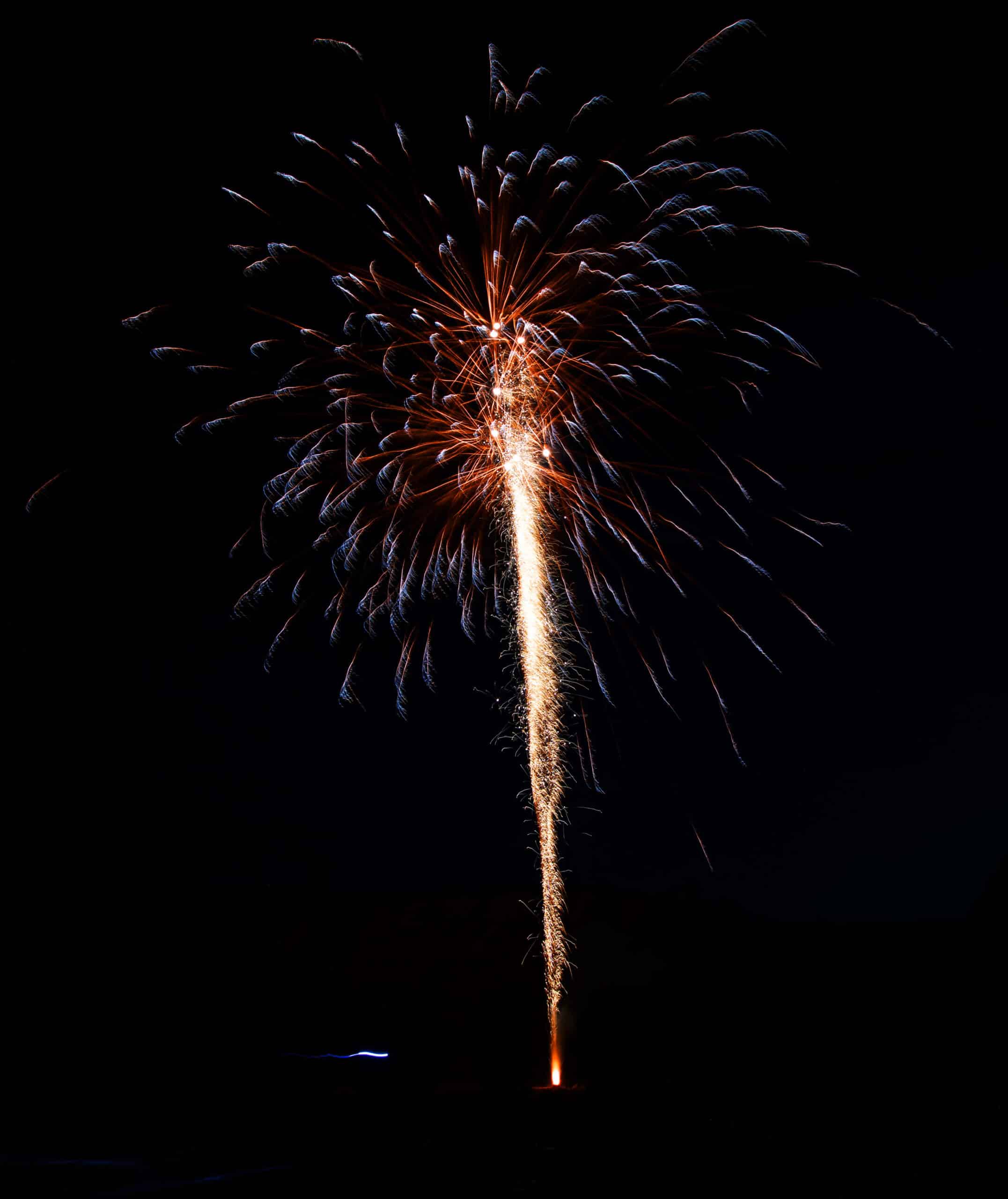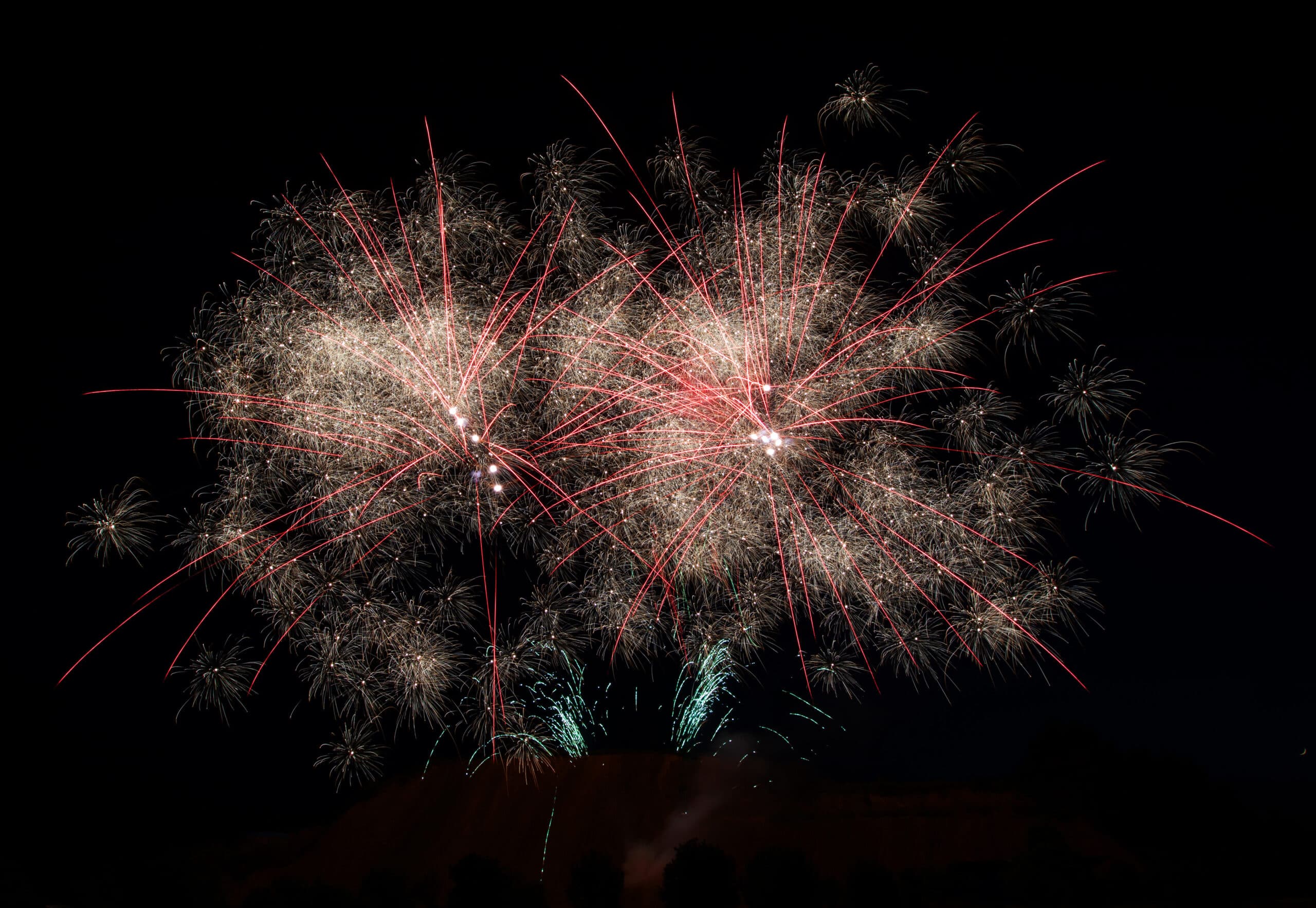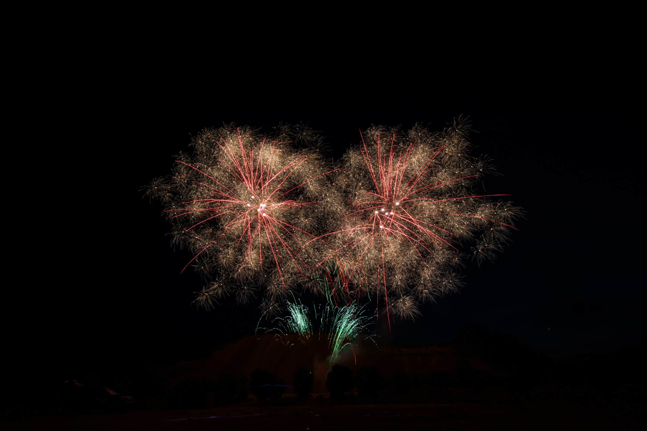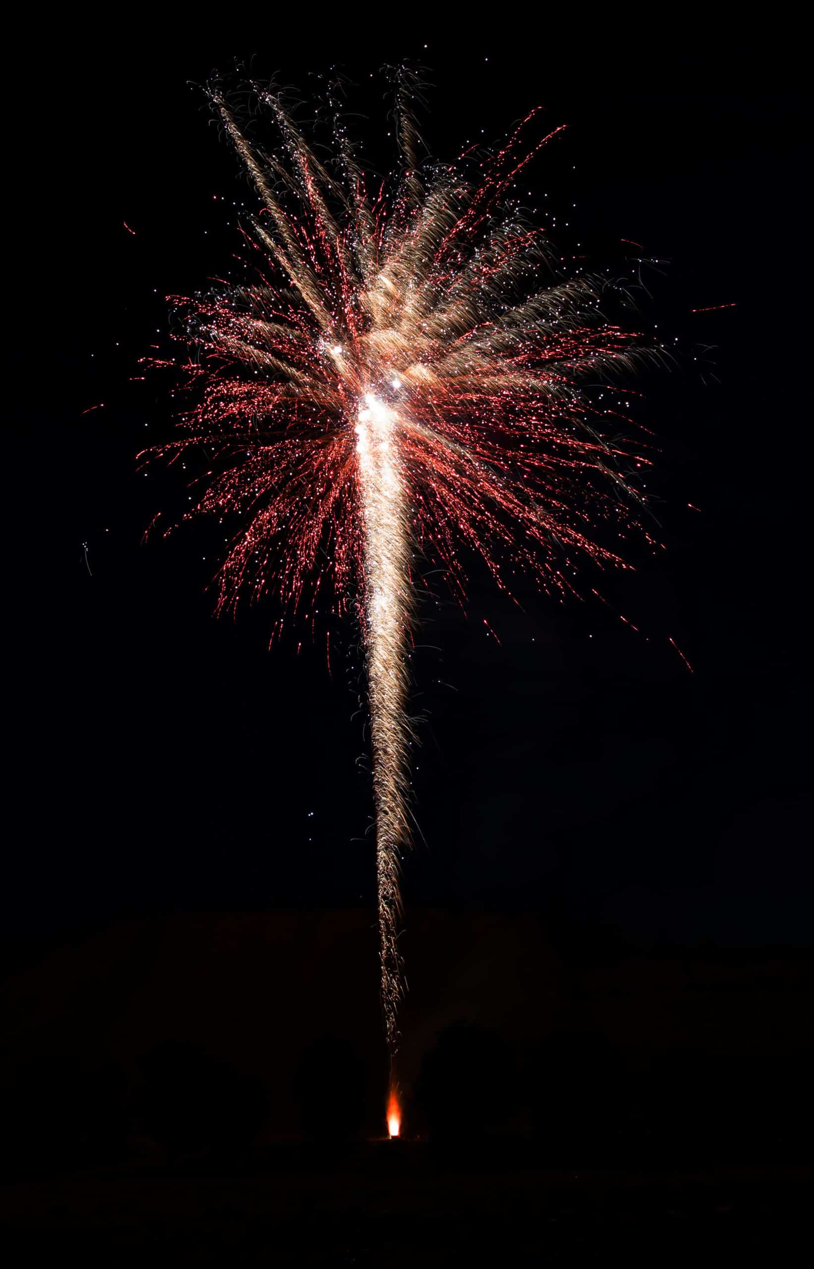 Variantenreiches Verbundfeuerwerk mit 4 Batterien und 124 Schuss; Phase 1: Grün glitzernde Feuertöpfe mit goldenen oder roten Blinkkometen, gefolgt von knisternden Chrysanthemen- Salven; Phase 2: Crackling-Aufstieg goldener Palmen mit Silberspitzen, gefolgt von Dragon- Egg-Effekten mit grün oder rot fallenden „Leaves-Effekten“ und anschließenden, gegabelten Feuertöpfen mit Popping-Chrysanthemen; Phase 3: Grün oder rot aufsteigende Leuchtsterne mit anschließender Verwandlung zu Silberchrysanthemen mit lang ziehenden Kometen, gefolgt von mächtigen Crackling-Fächern; Phase 4: Rasanter Abschluss aus 24 „Chaos-Kometen“, endend in 2 Salven mit lang ziehenden Knattersternen mit roten Blinkern.