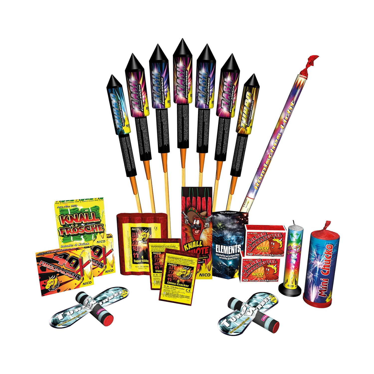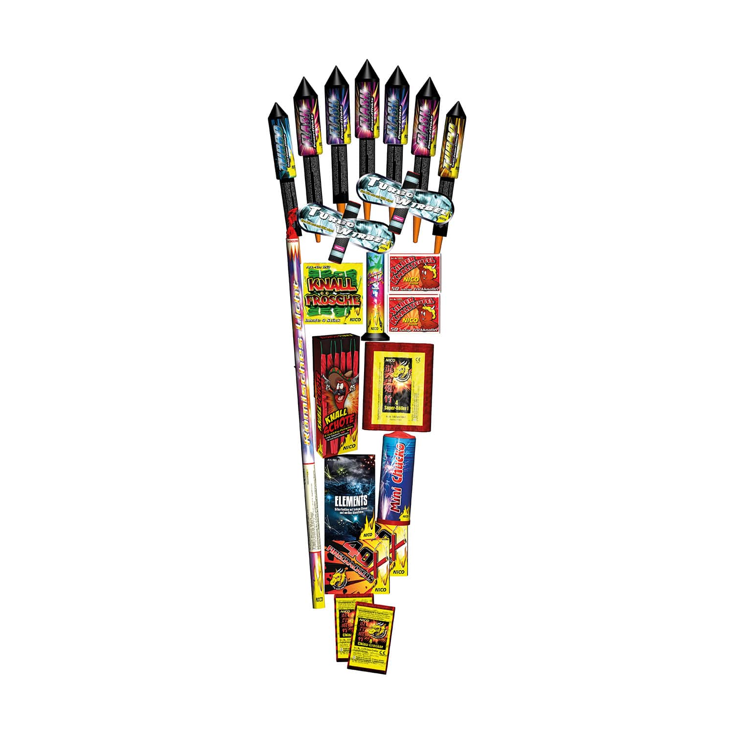 Großes Familiensortiment mit 7 Kopfraketen mit Blitz-Zerlegern (Flash-Powder) und 221 Effekten. Mit seinen Leucht- & Knalleffekten bietet es ein Erlebnis für die ganze Familie.