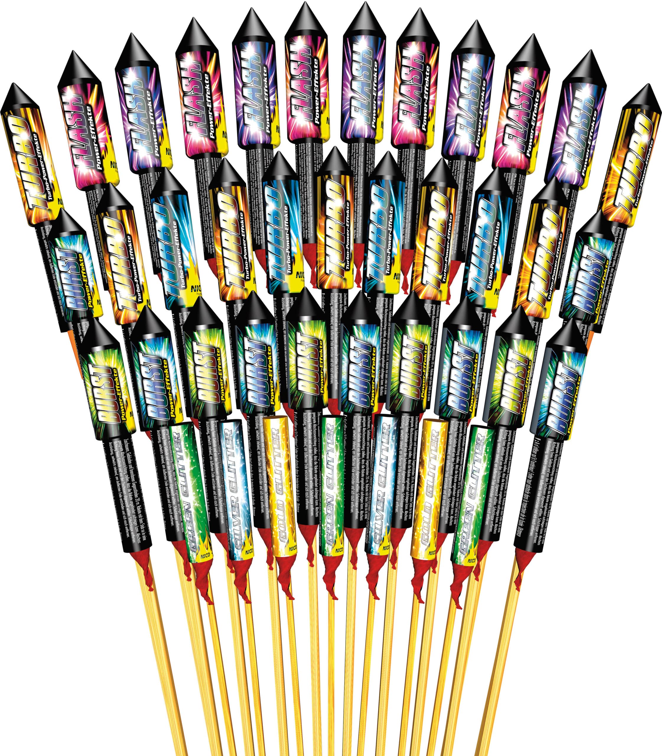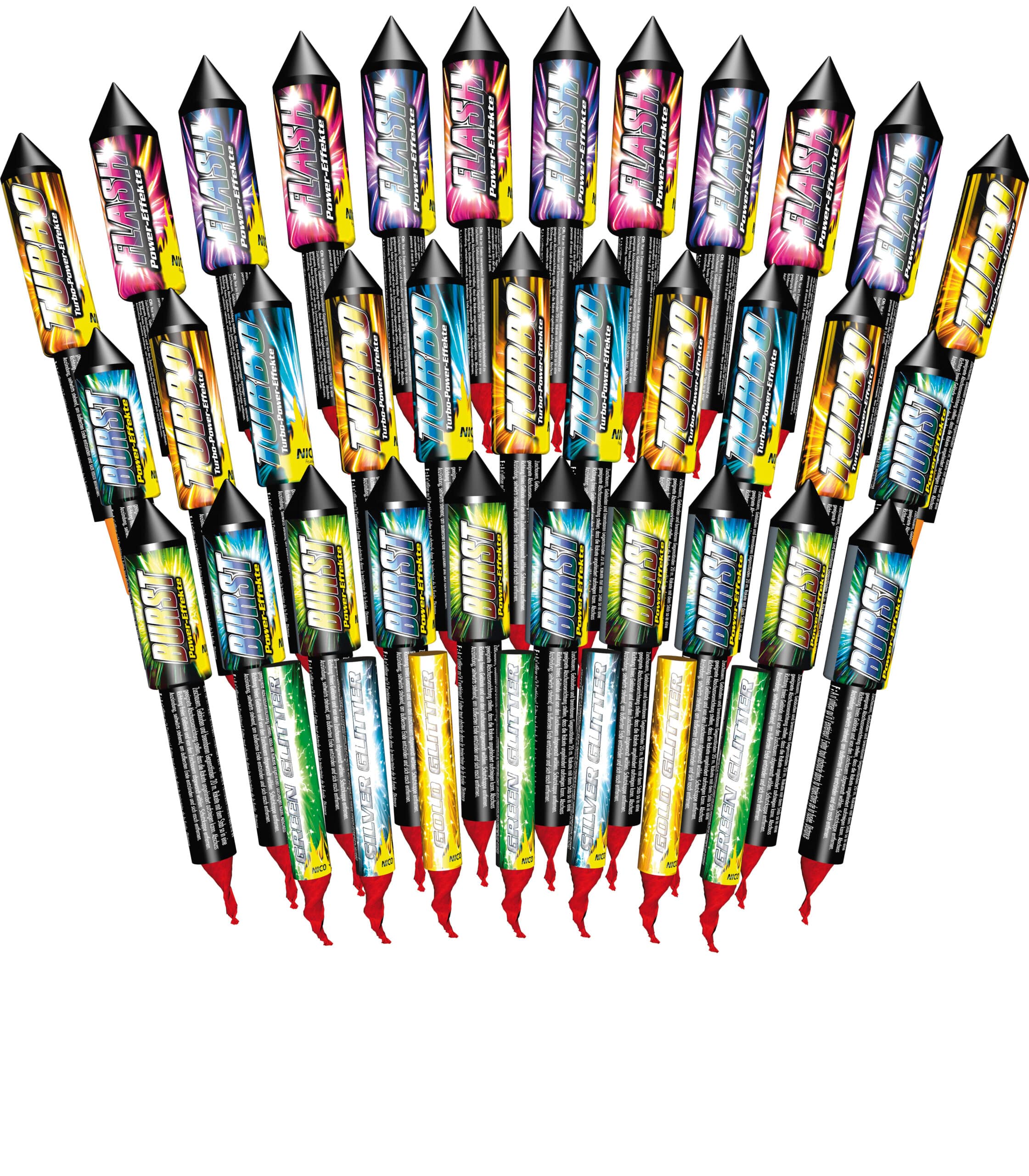 40 rasante Super-Effektraketen lassen farbenfrohe Sterne am Himmel erglühen.
